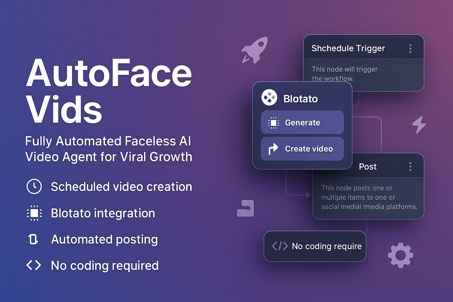 AutoFace Vids is a 100% automated AI Agent built on n8n/Make and Blotato that researches, scripts, generates, voices, stitches, and posts faceless AI videos to every major social media platform, without requiring users to sign up for multiple tools or learn video editing. It streamlines the entire faceless content creation pipeline into a no-code agent so anyone, from marketing newbies to seasoned pros can jump in and start posting viral content today.